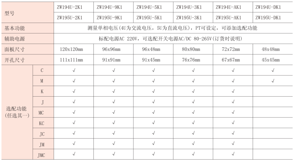 注:“√”代表可選配置,“J”代表報(bào)警輸出,“M”代表模擬量輸出,“K”代表開關(guān)量輸入,“C”代表